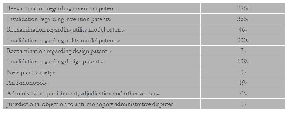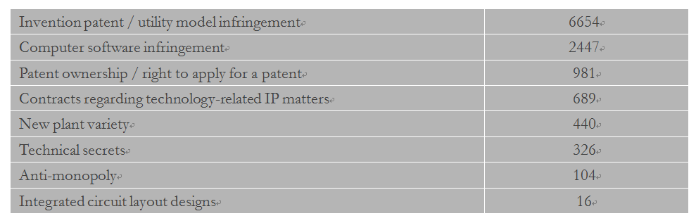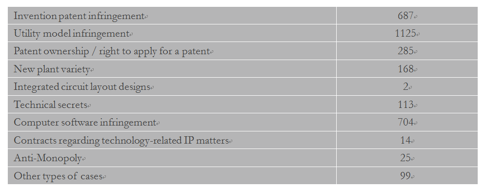 Among the newly received second-instance civil cases1, 3,222 were substantive in nature. A large amount of these cases were related to invention patent infringement and, especially, utility model infringement.