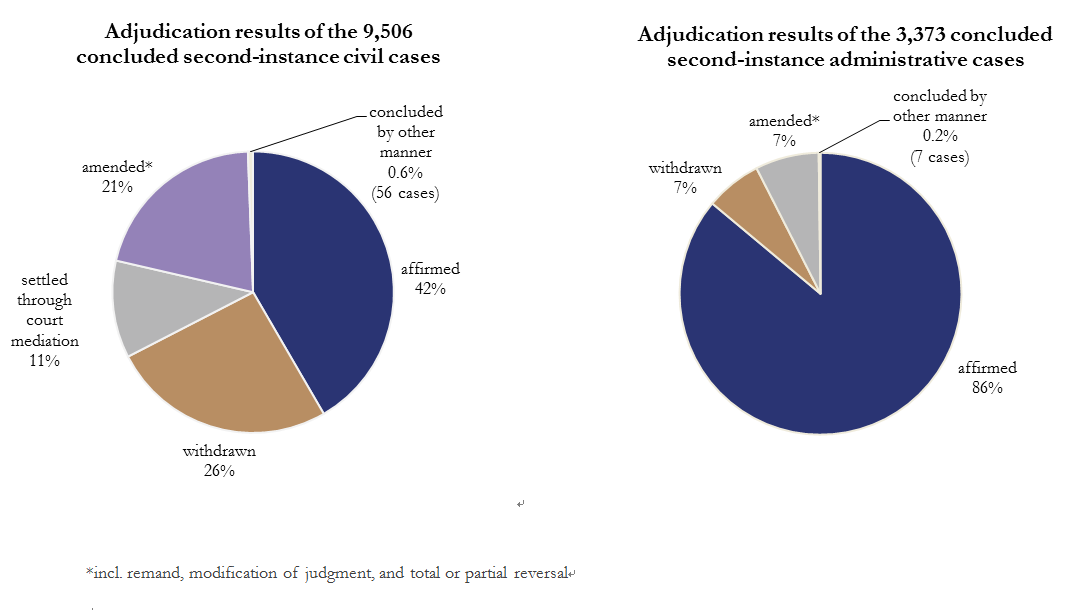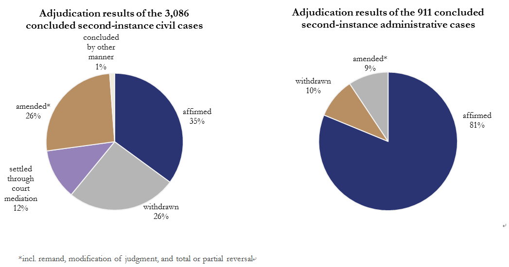 In 2023, the IP Court continued to see significant increases in both newly received and concluded second-instance (appeal) civil and administrative cases involving technology-related intellectual property matters and anti-monopoly matters (the court's designated subject matter jurisdiction).