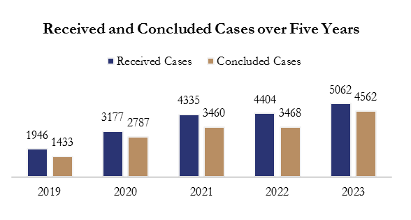 During the year, the IP Court received 5,062 new cases, representing an increase of 14.9% over 2022. In total, 4,562 cases were concluded, representing an increase of 31.5%. On average, around 140 cases were assigned to one judge and about 82 cases were concluded by one judge.