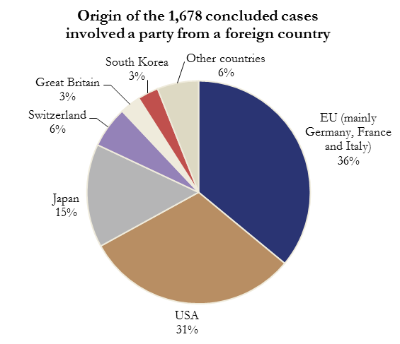 The IP Court received in total 1,934 cases that involved a party from a foreign country (1,678 cases) or Hong Kong/Macau/Taiwan (256 cases) in the past five years, representing 10.2% of the total received cases. 1,422 cases were concluded or about 9.1% of the total concluded cases.